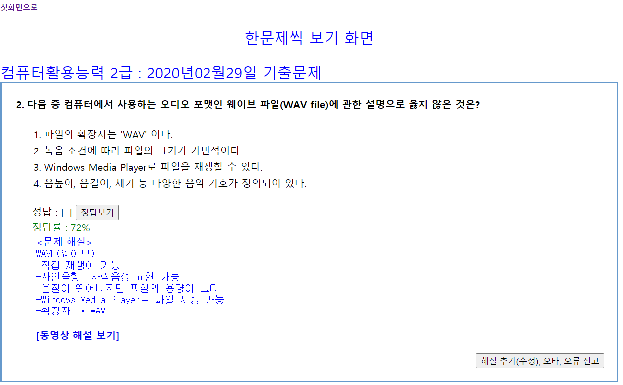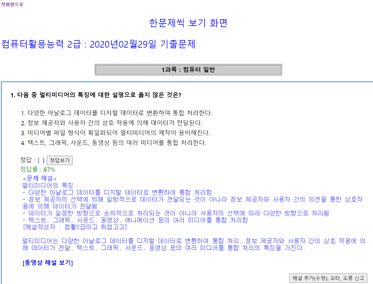 또한 한문제씩 보기 화면 하단에 보면 동영상 해설보기란이 있는데 저게 독학하는 사람들에게는 굉장히 유용한 기능이라고 생각한다. 유튜브 영상으로 모든 문제를 친절하게 설명해주시는 선생님 덕분에 학원을 가지 않고도 컴활2급 필기시험을 단 한번에 합격할 수 있지 않았을까 싶다.