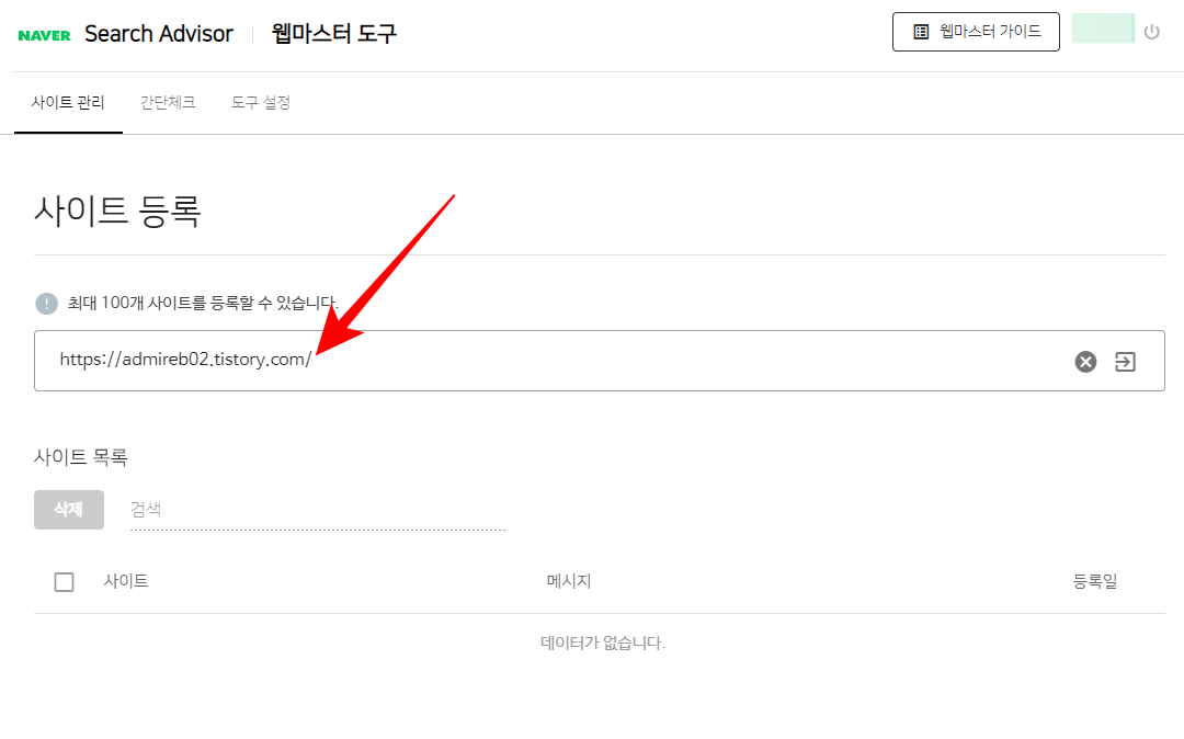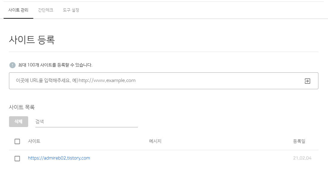 그럼 사이트 등록탭을 볼 수 있는데, 내 티스토리 도메인 주소를 입력하고 다음 버튼을 눌러주자