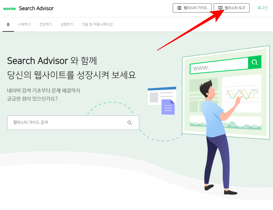사이트에 접속하면 오른쪽 캡쳐와 같이 메인페이지가 뜨게 되는데 오른쪽 상단의 [웹마스터 도구] 클릭