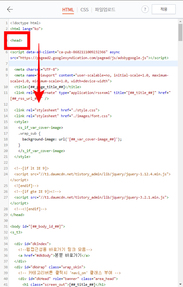 HTML을 모르시는 분들은 그냥 <head> 아래의 빈공간에 붙여넣기 하시면 된다.