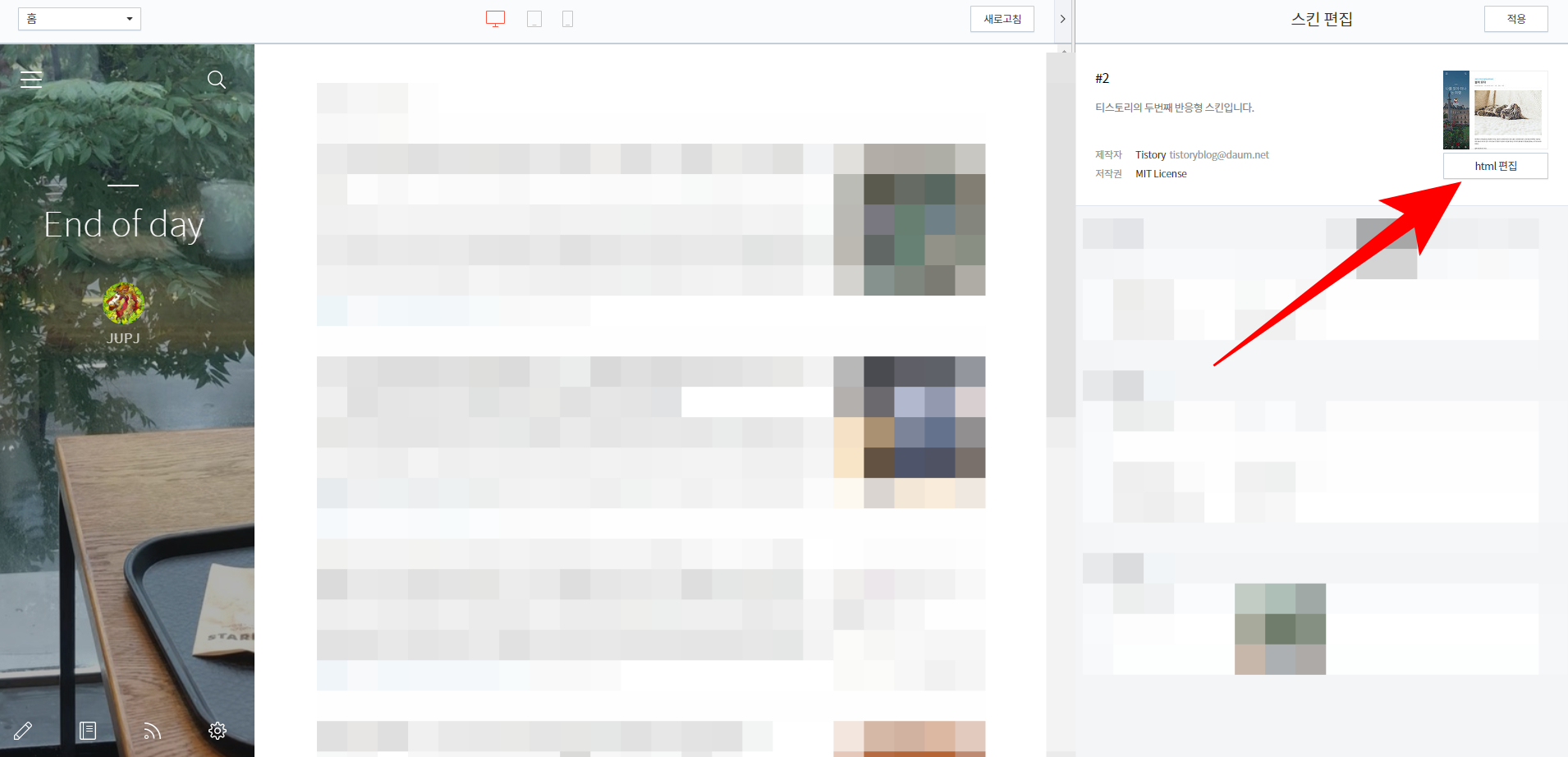 티스토리 관리창에 [꾸미기] 탭에 [스킨편집] 에 들어가면 오른쪽 사진과 같이 [HTML편집] 탭이 있다. 저걸 클릭