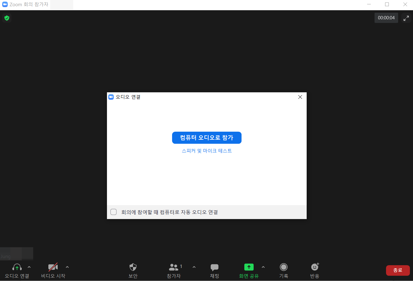 그럼 줌에 익숙한 창이 뜨게 되는데 아래 하단의 [비디오시작] 옆의 [^] 화살표를 눌러보자