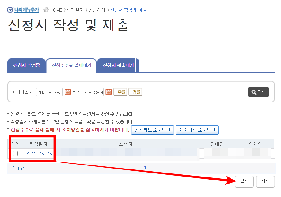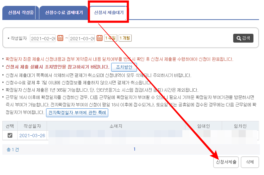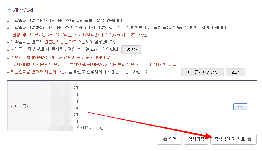[작성확인 및 완료] 버튼을 눌러 확정일자 신청 서류를 제출하자