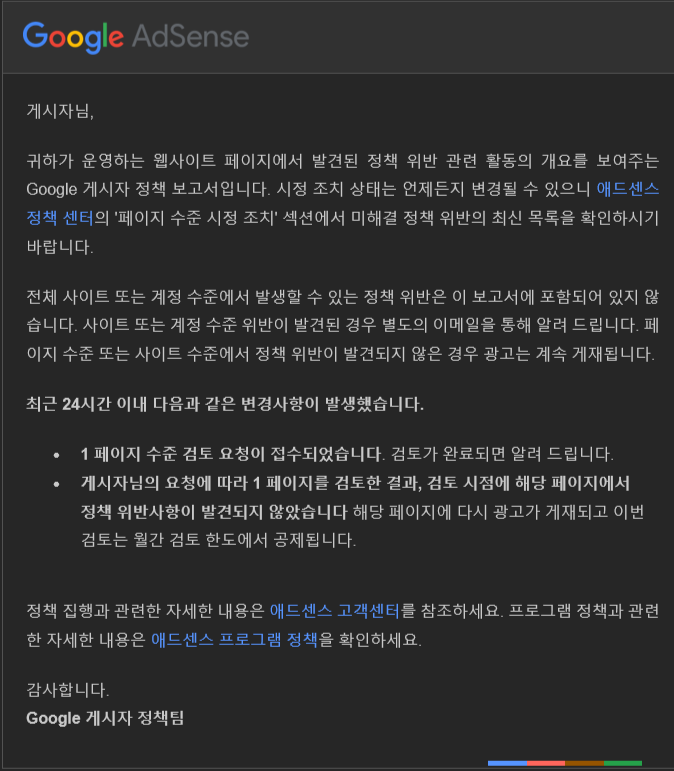 위와 같은 메일을 받으면 구글 애드센스 게시자 정책 위반 해결 완료!