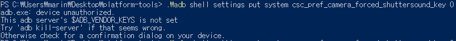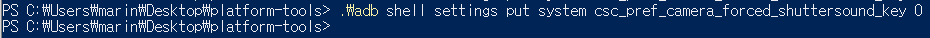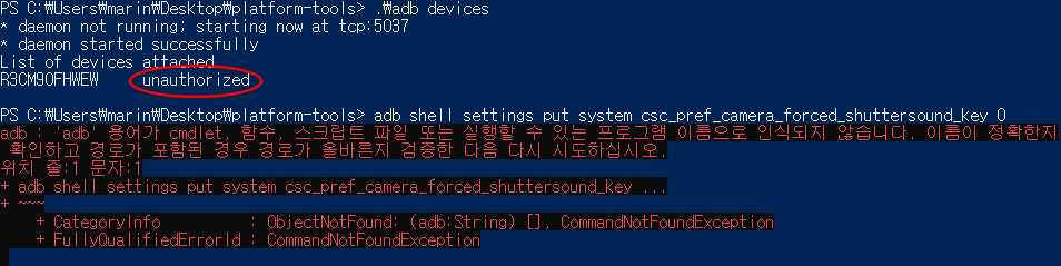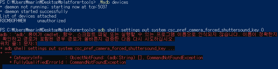 PowerShell에서 연결을 확인 했다면 'adb shell settings put system csc_pref_camera_forced_shuttersound_key 0' 라는 명령어를 입력하고 ENTER를 치면 끝. (스크린샷처럼 아무런 메세지가 뜨지 않으면 성공)