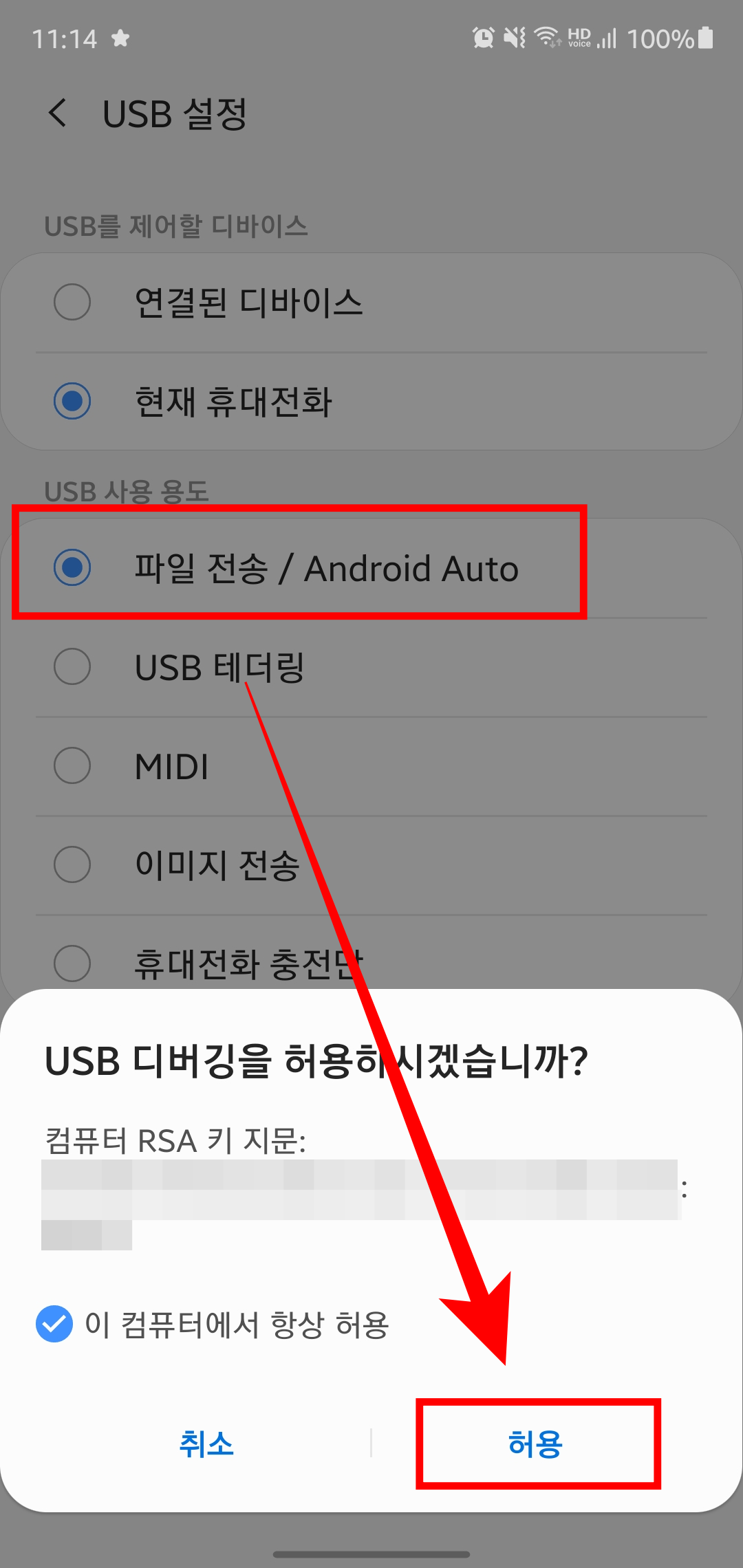 .\adb devices 명령어를 입력했을때 aunauthorized 가 뜨게 된다면 내 휴대폰의 USB설정을 확인해 보자