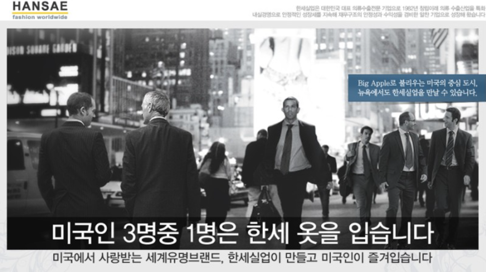 대표적으로 미국인 3명중 1명은 한세 옷을 입습니다 라는 문구로 유명한 한국의 한세실업을 꼽을 수 있다.